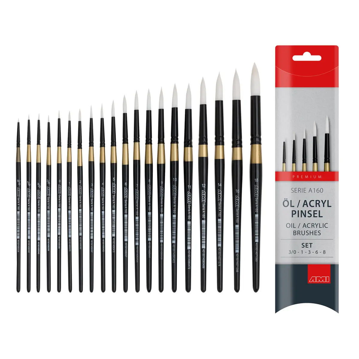 Saksalaisen AMI:n laadukas öljy- ja akryylisivellinsarja A160. Sarjan siveltimet ovat pyöreitä taiteilijasiveltimiä valkoisesta synteettisestä karvasta. Saumaton musta holkki ja lyhyt, mustaksi lakattu varsi. Sopii akryyli-, öljy- ja guassimaalaukseen. Erinomainen hinta–laatusuhde. Siveltimet saatavissa kokoluokissa: