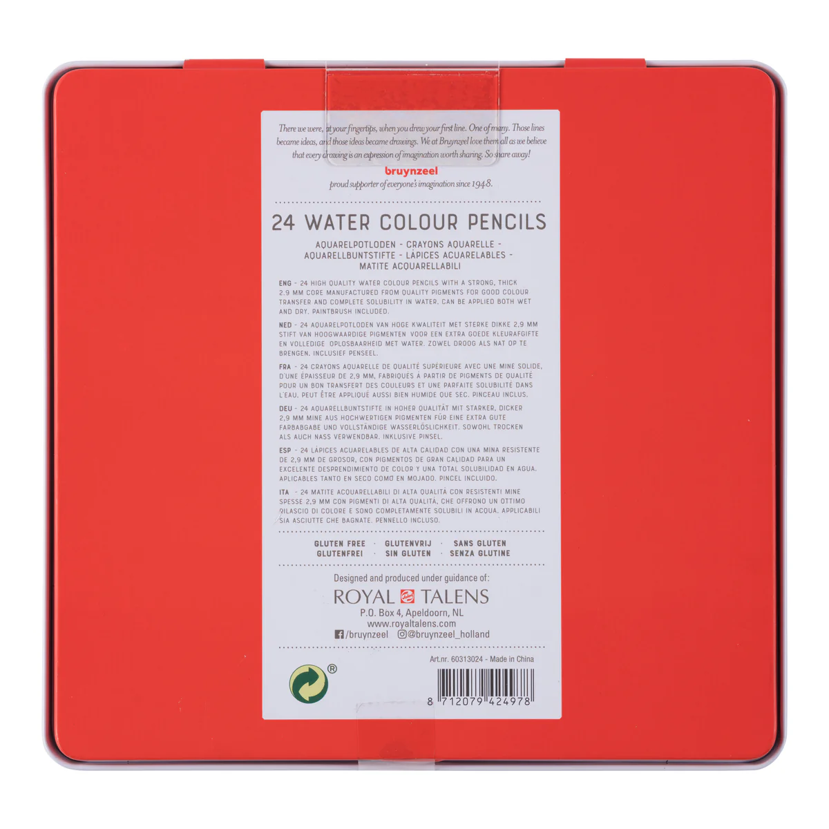 Bruynzeel-akvarellikynät 24 kynän metallirasiassa. Voit käyttää akvarellikyniä normaalien puukynien tapaan tai halutessasi veden kanssa, jolloin ne toimivat akvarellivärien tapaan. Kokeile ja ihastu!