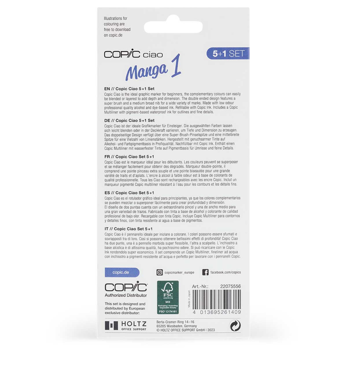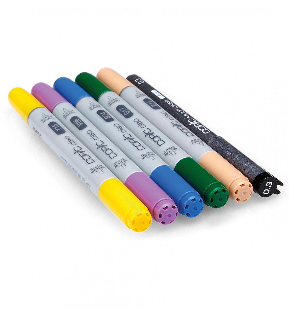 Copicin 5+1 setteihin on valikoitu aihepiireittäin viisi Ciao-huopakynää ja yksi musta 0,3-kokoinen multiliner. Ciao on Copicin alkoholipohjaisten huopakynien eniten myyty malli 180 sävyllään. Täytettävissä kaksipäisissä kynissä on sekä sivellin että puolileveä kärki. Kärjet on vaihdettavissa Sketch kynän kärkiin. Ciao on kynistä edullisin ja vie vähiten tilaa, mutta laadullisesti prikulleen samalla viivalla kuin muut Copic-mallit. Erot ovat kynän muotoilussa sekä värin määrässä. Superhyvä kynä huokeammalla hinnalla, ja sopii esim. aloittelijoille ja opiskelijoille ammattilaisten ohella. Riittoisuus: leveällä terällä keskimäärin 2,7 x B4 arkki (B4 = 257 * 364 mm).