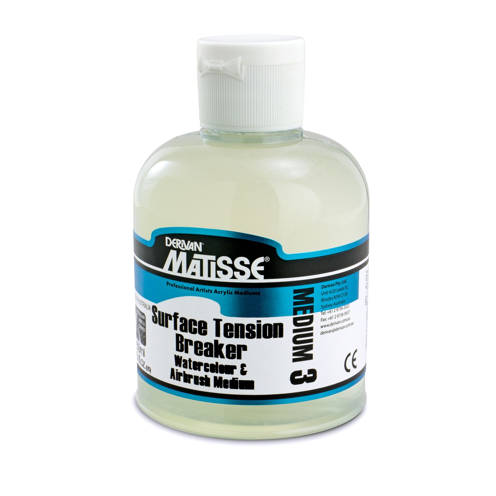 Matisse MM3 Surface Tension Breaker on akryylimaalausaine, joka pienentää veden pintajännitystä ja parantaa värin imeytymistä huokoisiin pintoihin, kuten raakakankaalle ja akvarellipaperille. Sen avulla akryylivärit levittyvät tasaisemmin ilman vesipisaroiden tai laikkujen muodostumista.