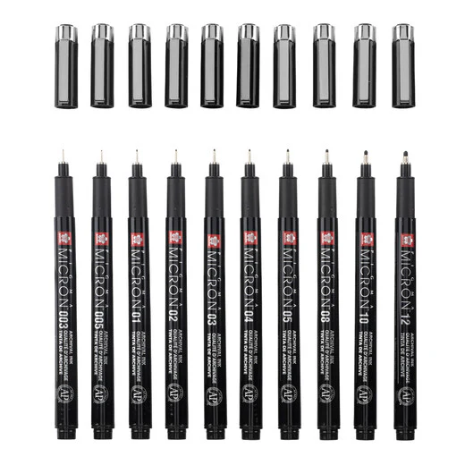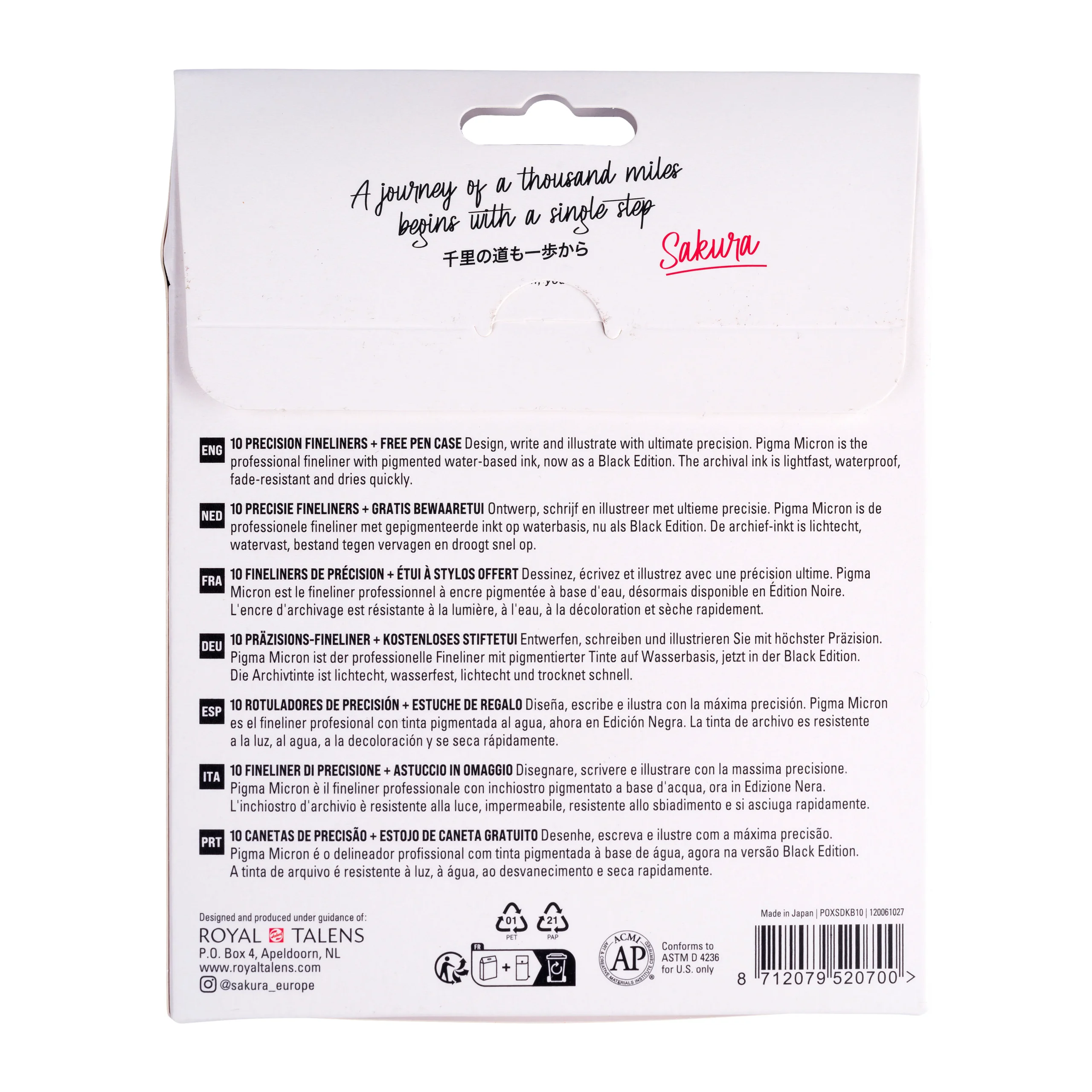 Tässä Pigma Micron Black edition -setissä on 10 mustavartista huopakynää mukavassa huopapussissa. Mukana seuraavat kynät: