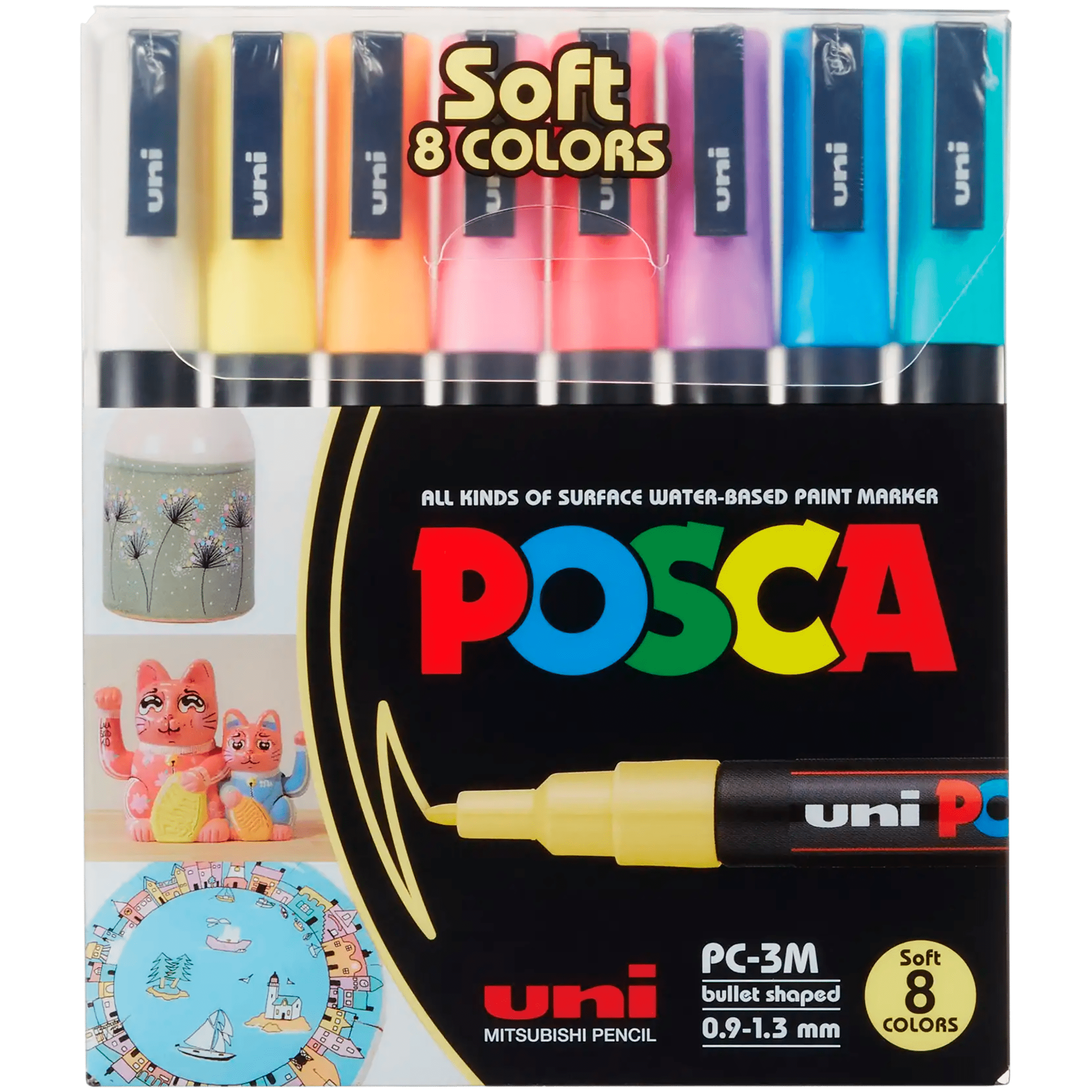 Posca setissä on 8 kappaletta pastellisävyistä PC-3M kynää. Kynissä on fine 0,9-1,3 mm polyesterkärki. Posca on korkealaatuinen vesipohjainen tussi. Valikoima koostuu laajasta värivalikoimasta. Kynän jälki on peittävä ja se soveltuu hyvin erilaisille pinnoille kuten kartongille, kivelle, tekstiileille, puulle, muoville, keramiikalle, metallille ja lasille. Useimmilla pinnoilla suositellaan käytettäväksi suojaavaa lakkaa ja uunissa kuumentamista, jotta lopputuloksesta tulee kestävä. Sulje korkki tiiviisti käytön jälkeen.