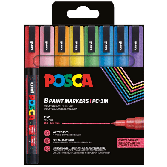 POSCA:n huippusuosittu uutuus! POSCA setissä on 8 kappaletta PC-3M kynää. Glittervärit: punainen, roosa, oranssi, keltainen, vihreä, vaalean sininen, sininen, violetti. Kynissä on fine 0,9-1,3 mm polyesterkärki. POSCA on korkealaatuinen vesipohjainen tussi. Valikoima koostuu laajasta värivalikoimasta. Kynän jälki on peittävä ja se soveltuu hyvin erilaisille pinnoille kuten kartongille, kivelle, tekstiileille, puulle, muoville, keramiikalle, metallille ja lasille. Useimmilla pinnoilla suositellaan käytettäväksi suojaavaa lakkaa ja uunissa kuumentamista, jotta lopputuloksesta tulee kestävä. Sulje korkki tiiviisti käytön jälkeen.